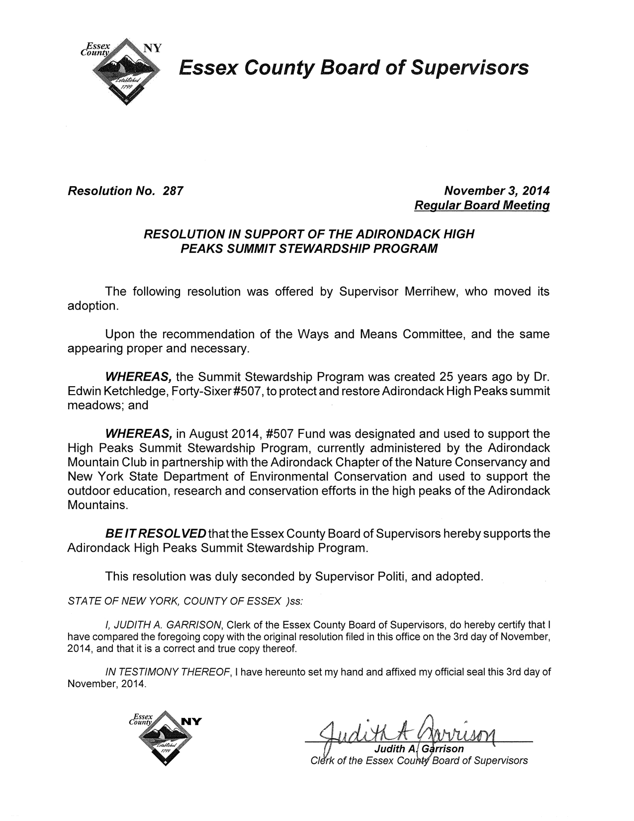 On November 3, 2014, the Essex County Board of supervisors (18) honored Dr. Edwin Ketchledge (1924-2010, Forty-Sixers #507) life dedication to the Adirondack Mountains alpine summit preservation and the value of the Summit Stewardship Program unanimously adopting Resolution No. 287!